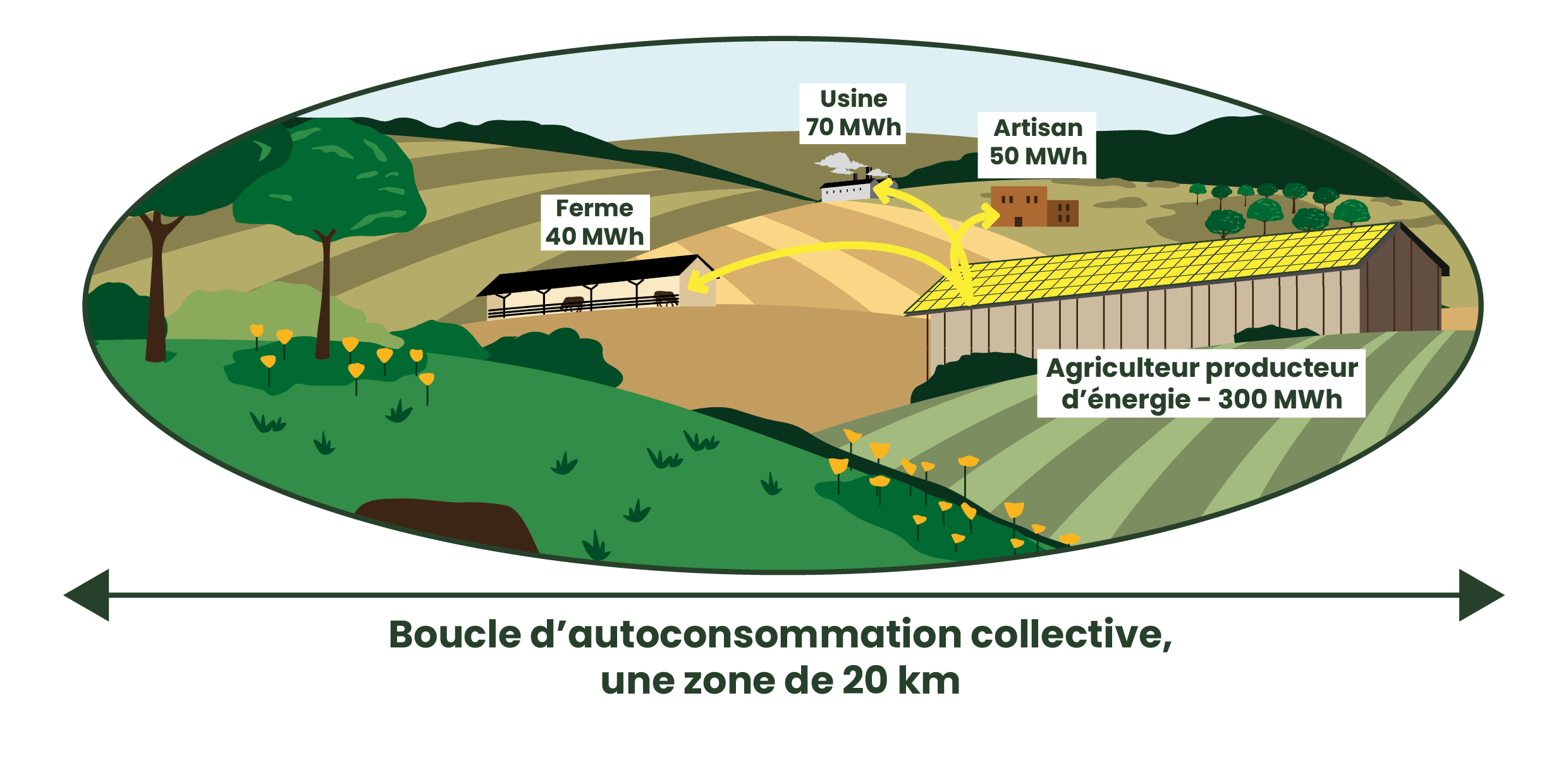 Grâce au cadre réglementaire actuel, l’État permet désormais l’échange d’électricité dans un rayon de 20 km autour de chaque installation : c’est le principe de l’autoconsommation collective.